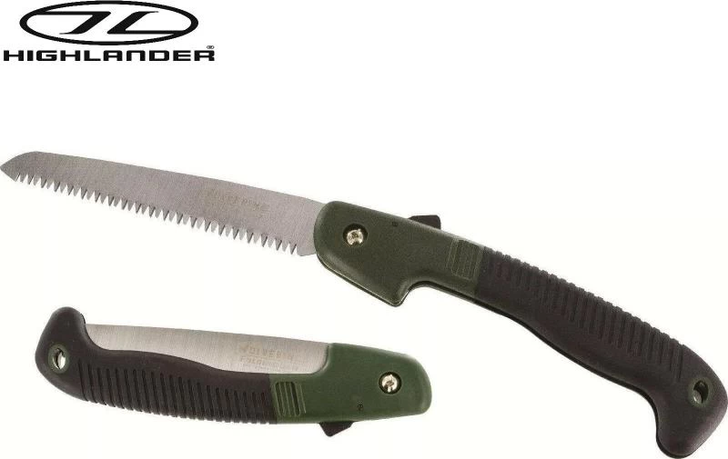 A large folding saw with jagged edge for cutting green and dead wood with ease.